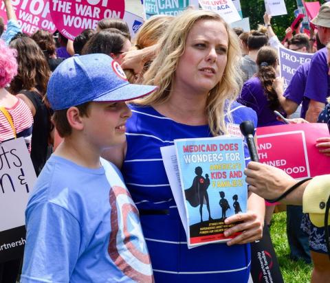 Felicia Willems (and son) talking to media about MomsRising's effort to stop Congress from gutting Medicaid funding.