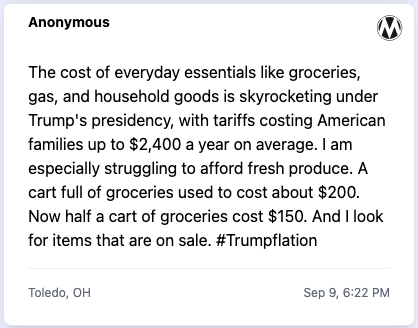 Not on social media? Prefer to submit your story directly? Use our Trumpflation website to report your experiences with rising costs and upload your photos.