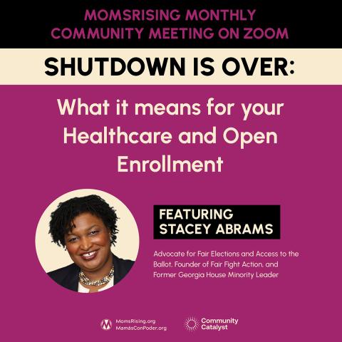 MomsRising members heard directly from Leader Stacey Abrams about what the loss of federal health subsidies could mean for their family, shared personal stories with her about how the current changes to health care are impacting them, and connected with one another to find out how we can come together to take action in our communities.