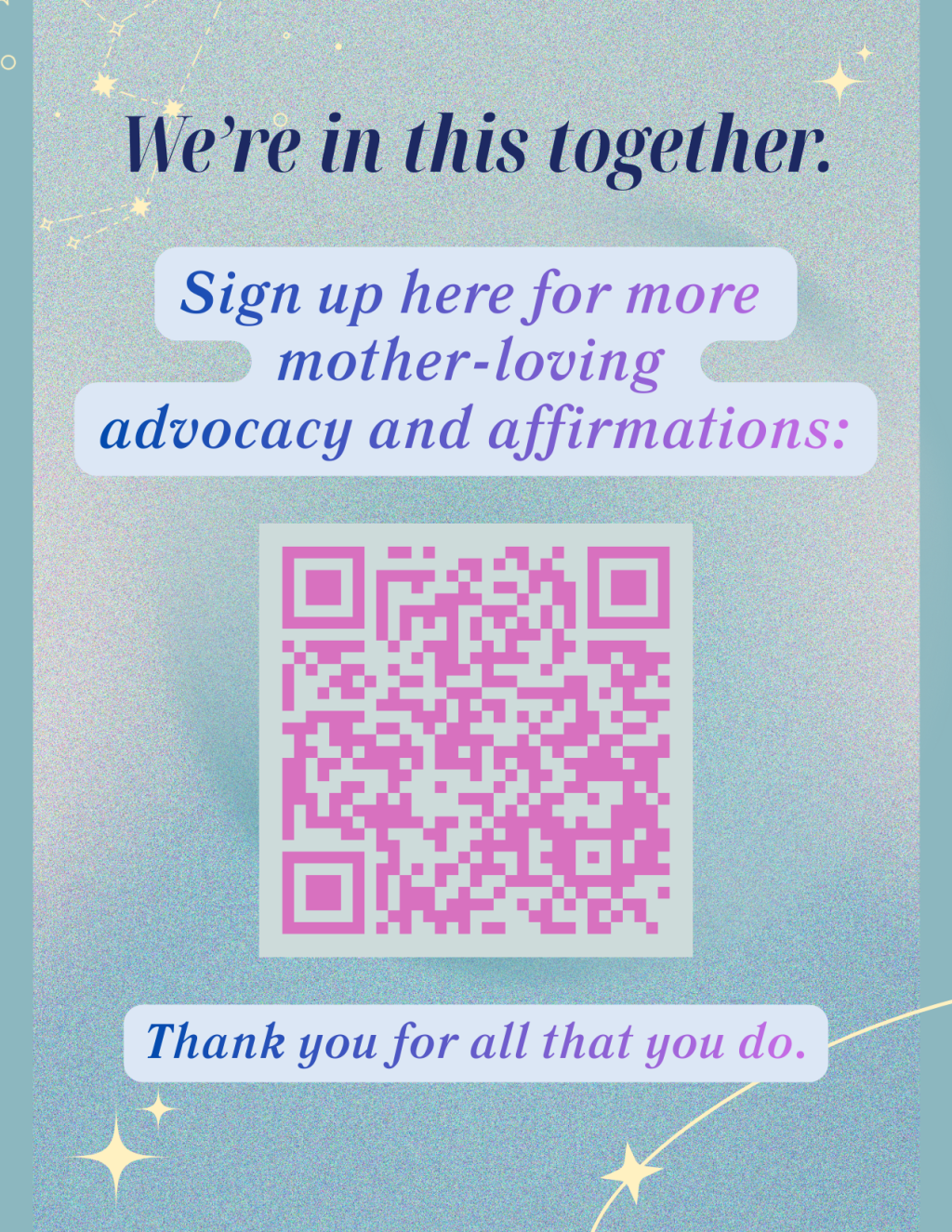 Make your very own Mother-Loving Advocacy Affirmations zine by downloading this PDF, printing it double-sided on a single page, and folding/cutting it into a zine like this!