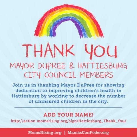 MomsRising and our partners at E³ Health Initiative are coming together to hand deliver the giant “Thank You!” card YOU signed to Mayor Dupree and City Council members, Kim Bradley, Deborah Delgado, Carter Carroll, Mary Dryden, and Henry Naylor. The “Thank You” card recognizes their work to decrease the number of uninsured children in the city and to ask them to continue their work to improve children's health in Hattiesburg.