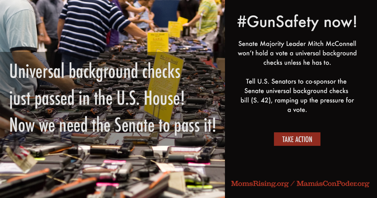 BACKGROUND: The U.S. House has passed universal background checks on gun sales. Now it's the Senate's turn. But Senate Majority Leader Mitch McConnell won't bring the bill to a floor vote unless he is forced to. Tell your U.S. Senators to co-sponsor the universal background checks bill in the Senate (S. 42) -- the more co-sponsors, the more pressure on Senator McConnell to bring the bill to a floor vote. With public support for universal background checks as high as 97% in recent polls, every member of Congress should be supporting this commonsense measure to reduce gun violence! Tell your U.S. Senators to co-sponsor the universal background checks bill in the Senate (S. 42) -- the more co-sponsors, the more pressure on Senate McConnell to bring the bill to a floor vote.