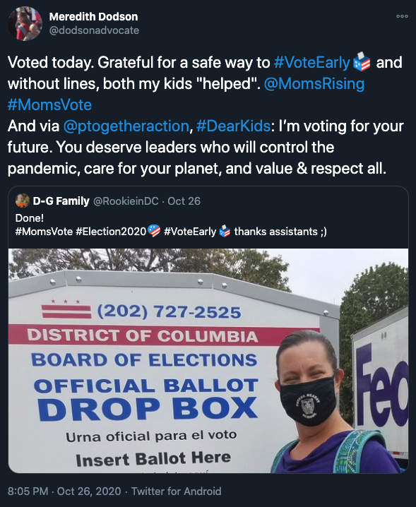 Moms are a powerful and effective force for good, and they are particularly AWESOME at getting out the vote! This weekend, we asked MomsRising member Meredith Dodson, who volunteered to phone bank with our MomsVote program and is also the Director of U.S. Poverty Campaigns at RESULTS, to share her "why she rises" story with us.