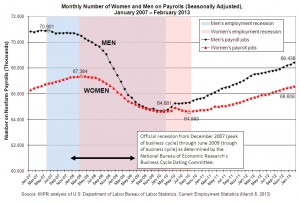 IWPR analysis of the BLS payroll data shows as of February, women have regained 74 percent (2 million) of the total jobs they lost in the recession from December 2007 to the trough for women’s employment in September 2010 (2.7 million). Men have regained nearly 62 percent (3.8 million) of the jobs they lost between December 2007 and the trough for men’s employment in February 2010 (6 million). In the last year, from February 2012 to February 2013, of the 2 million jobs added to payrolls, 931,000 or 47 percent were filled by women, and 1,035,000 or 53 percent were filled by men. The gap between women’s and men’s employment is 1.8 million jobs in February, substantially less than at the start of the recession (3.4 million jobs in December 2007).