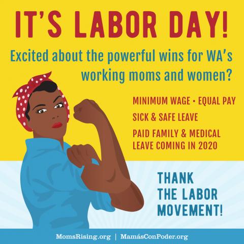 ![Today, join MomsRising in thanking the labor movement by sharing on social media why strong unions are important to you. [Image description: graphic with a woman with brown skin with arm flexed as Rosie the Riveter. Text: “It’s Labor Day! Excited about the powerful wins for WA working moms and women? Minimum wage. Equal Pay. Sick and Safe Leave. Paid Family & Medical Leave]](https://www.momsrising.org/sites/default/files/styles/large/public/Labor%20Day%20Graphic%20FB.jpg?itok=f8tnWM0a)