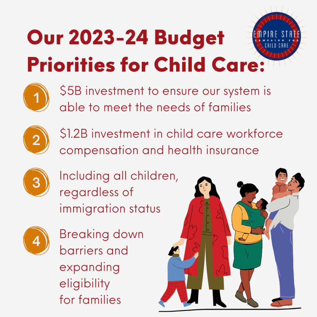 The Empire State Campaign for Child Care's priorities for 2023-2024 budget focus on getting more families access to the child care they need, along with big investments in the child care workforce, and asks the NY legislature to ensure that all children, regardless of immigration status, can access child care. One of the most important priorities is to help break down barriers to child care and expand eligibility (which means MORE families have access to child care!)