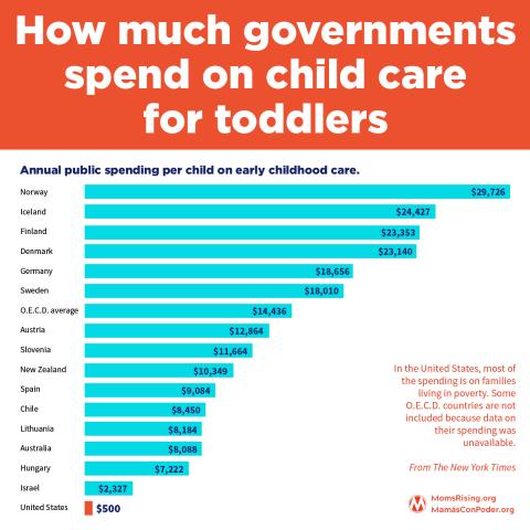 The NY times recently shared shocking statistics about early child care support in the United States. It turns out rich countries contribute an average of $14,000 per year for a toddler’s care, compared with just $500 in the U.S. The US ONLY spends $500 on early child care compared to similarly resourced nations! In Europe, new parents have paid leaves of 14 months, on average, and it’s common for children to start public school at age 3.