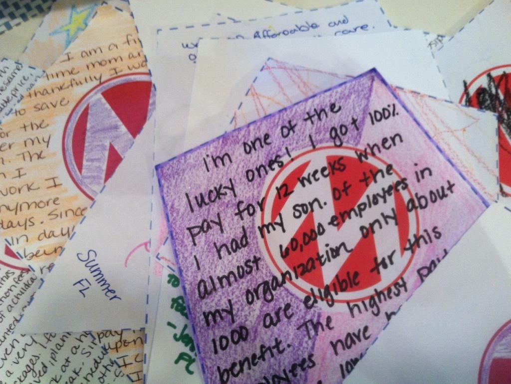 Once I started talking to people about making work places friendlier for families I realized that everywhere I went and most everyone I knew had a story. Some of these stories have been about how wonderful it is to work for a company that values families—about paid leave, earned sick time, or having a flexible schedule—but most have been about families struggling to make it.