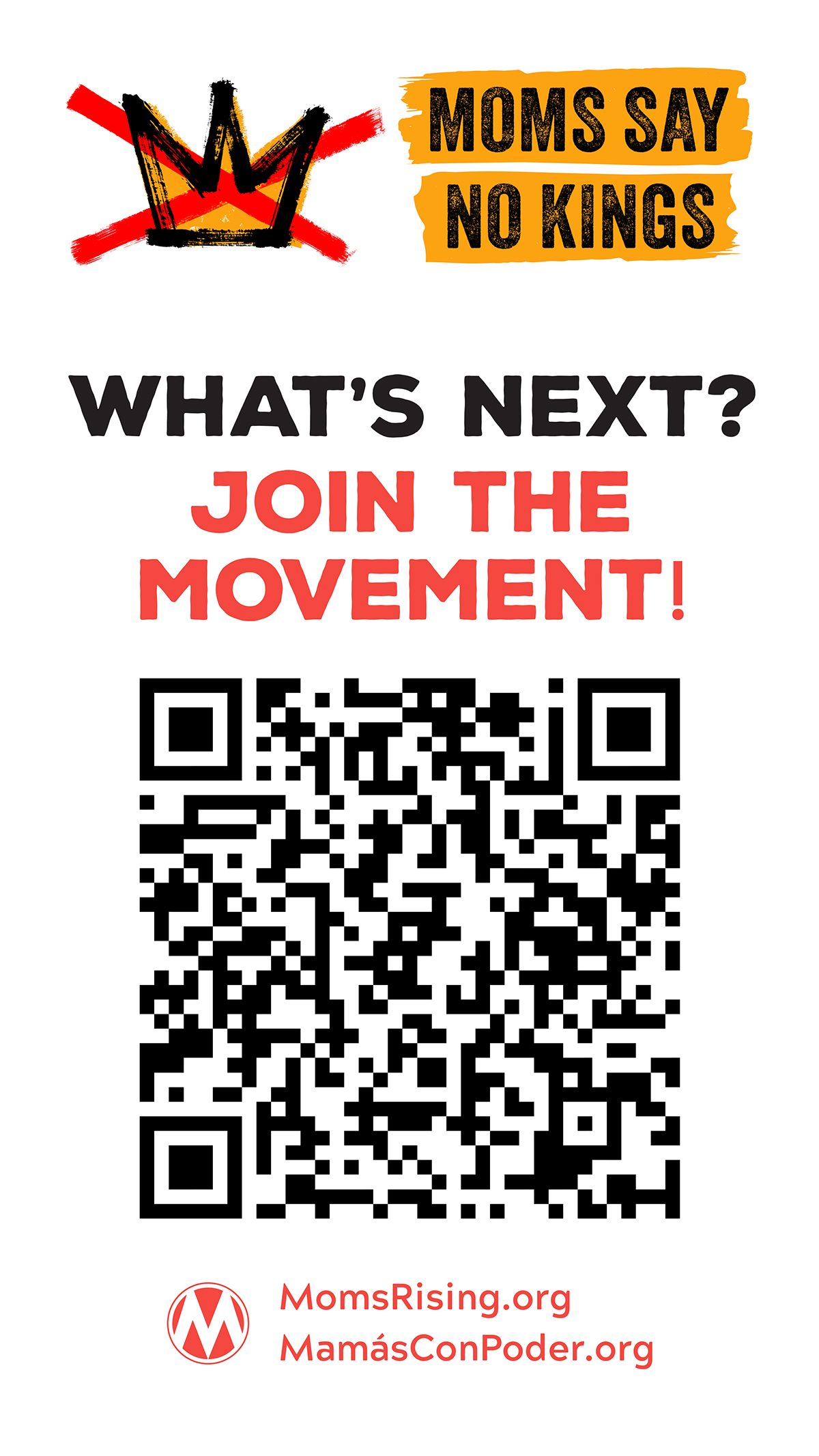 --> Planning to attend an event? We’ve got you covered with signs—complete with a QR code to invite others to take continued action with MomsRising too! You can download printable signs, along with a graphic to have on your mobile device (and maybe even set as your phone home screen) to help recruit others to join MomsRising while you’re on the ground at No Kings events: